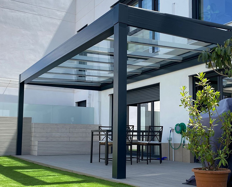 La pérgola Solario o pérgola plana es una cubierta de aspecto exterior plano que aporta una visión limpia con líneas puras, integrándose en los espacios exteriores de los diferentes tipos de arquitectura.